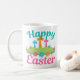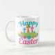A beautiful religious Happy Easter mug for a Christian celebrating Jesus Christ rising on Easter Sunday with pretty teal and pastel pink writing and crosses above a green field of flowers. A cute Easter holiday gift for a child's Easter bunny basket in lovely colours.