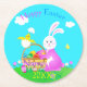 A cute pink bunny holding an Easter basket filled with colourful Easter eggs, a chick just hatched, and a message of “Happy Easter.”