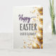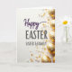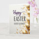 This greeting card features a layered Easter greeting centered on a soft off-white background with a gentle shimmer, setting a cozy tone for family closeness 🌷. The word “Happy” sits at the top in deep plum, written in flowing, connected lettering that feels like a warm note shared between loved ones. Under it, “EASTER SISTER & FAMILY” is set in neat grey uppercase letters, giving the message a steady, grounded look. Tiny golden specks and pearl-like beads float across the backdrop in a softly blurred way, like light catching on decorations during a quiet family gathering. Along the right side, a vertical row of shiny gold egg-shaped ornaments adds a sense of celebration, their glow suggesting a shared moment of togetherness 🐰. Each ornament shows raised details such as small bows, dotted textures, and geometric patterns, creating a rich surface that draws the eye without overpowering the text. The ornaments appear slightly out of focus compared to the crisp lettering, adding depth as if the greeting is photographed among real decorations. A golden cascade of patterned eggs runs down the right edge against the softly sparkling background.