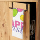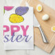 Kitchen towel features an original Easter-themed marker illustration of a handful of delicious colourful speckled malted egg candies, with HAPPY EASTER in a fun pink and purple font. Perfect for Easter decorating!