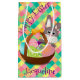 Easter - Colourful random chequerboard pattern in spring pastel colours including lemon yellow, carnation pink, blue-green and light green and two shades of orange. Image of a cute grey cartoon rabbit and an Easter basket with colourful eggs.
