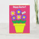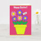 Designed with a flat, graphic look, this card centers on a cluster of five rounded flowers arranged snugly in a bright yellow pot, like a small bouquet offered with friendly affection 🌷. The blooms alternate between soft fuchsia and deep violet, each outlined in black with a sunny yellow circle at the center and a tiny white highlight that makes them feel lively. Green stems and simple leaves rise from the pot, giving the arrangement a tidy, garden-fresh base. Behind everything sits a hot pink background that makes the flowers stand out, like they’re being presented on a cheerful stage. A small white rectangular tag hangs from one violet flower, held by a curled black clip, and the tag reads “Teacher,” adding a thoughtful, appreciative touch. Across the top, “Happy Easter!” appears in rounded white letters, spaced clearly above the bouquet, with 🐰 tucked in as a light accent to the spring theme. A yellow border frames the scene with scattered spot-like shapes that add extra texture around the edges.