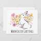 Watercolor image of yellow and purple spring flowers with a white bunny rabbit standing on his hind legs. Editable text reads "Warm Easter Greetings."