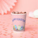 Happy Easter text with colourful Easter eggs on pink polka dot background pattern design.