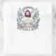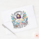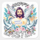 Happy Easter! with Jesus, and a colourful joyful image of spring, with doves and flowers.