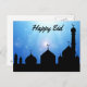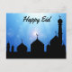 Black silhouette of a mosque on a blue sky with sun and sunrays.
