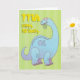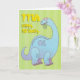 Big blue dinosaur eating a leaf, with a birthday greeting on a green background.