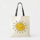 Drawing of a sun with a happy face on a natural coloured canvas bag; the black handles on the bag compliment the black border around the image
