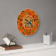 Happy Fall Scarecrow Pumpkin-Round Wall Clock-A nice clock for Halloween or Thanksgiving holiday season. The centre of the clock is a scarecrow cluster. The cluster has a hay stack, a scarecrow coming out of a pumpkin; indian corn and a potted sunflower. Decorative text reads: HAPPY FALL Y'ALL in all caps. The outer portion of the clock is layers and layers of colourful leaves with assorted pumpkins on top. The clock numbers are green. *A portion of this design is created using purchased psp script tools by Debs Design. Her scripts can be found here- www.scriptzrus.com.