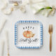 This boho fall autumn paper plate features a watercolor pumpkin and fall leaf foliage with a blue plaid pattern border.