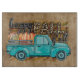 Pumpkin antique blue farm truck with Happy Fall Y'all in leopard animal print on an Autumn plaid distressed background.