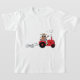 100% cotton so perfect for summer, It is a nicely designed t-shirt, the fabric is soft and the seams finished well, the body of the t shirt has no side seams. I bought a medium size for my two grandsons, aged 9 and 8 it will be slightly big on them but I would rather that than too small