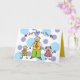 This card features a whimsical and cute cartoon illustration of a father holding the hands of his children, a boy and a girl on a background of blue polka dots.
