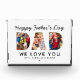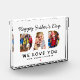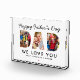 Create a stylish and memorable gift for Dad this Father's Day! This custom tabletop photo block features a collage of three favourite family pictures of the kids designed as a modern and bold sans serif typography design. Personalise the custom text with the names of the children and modify the black text, red heart, and white background if you would like different colours to coordinate with your home decor.