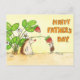 His father who is taller is kind enough, to grab the stem and bending it downwards so his child can reach it. Next to the strawberry plant is written "Happy Father's Day" in a warm brown colour, that matches the warm colour palette of the yellow background and the orange soil.