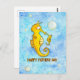 The background of this card is made of two different shades of blue, alternating to form a harmonious watercolor background. Here and there some airbubbles are slowly rising to the surface. In the foreground there two yellow seahorses, a small one and a bigger one. They are smiling at each other. The bigger one is the father. For seahorses, it is the male who has a pouch on its stomach, gives birth, and carries the babies. Underneath the two seahorses is spelled "Happy Father's Day" in orange hand written letters.