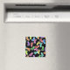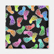 Illustration of lots of colourful footprints with happy smiling faces stomping around against a black background. Image available on various gifts and products.