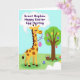 This card shows a stylized long-necked animal on the left, colored in warm ochre and sienna with gentle spots, eyes closed in a soft smile as it holds a patterned oval decoration by a lavender ribbon. The background is a pastel blue sky that feels like an early spring day, and the animal’s calm posture suggests a sweet, caring moment, like it’s bringing a small gift to someone special. On the right stands a simplified tree with a green canopy, its branches hung with more oval decorations in magenta, lavender, and golden yellow, dotted and speckled for extra charm 🌷. Along the bottom, a bright green ground supports the scene, with a small woven basket at the tree’s base overflowing with the same colorful ovals, while a few lie scattered nearby. In the upper left, a fluffy white speech-bubble shape holds the main message in purple lettering, set in clear, thick text that’s easy to read. The layout keeps the animal and tree facing each other across the page, creating a friendly, almost affectionate exchange between the two sides of the scene 🐰. The ovals vary in color and pattern, and several hang from the tree on small loops while others rest near the basket in the grass.