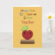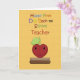 A cheery card for a teacher's first day back to school with a yellow background and a red apple with a smiling face inside sitting on two books. Apple was created using artwork by Clipart 4 Resale at DollarGraphicsDepot.