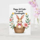 This card features a sweet little bunny 🐰 sitting snugly in a warm brown wicker basket, with big shiny eyes, soft lashes, and rosy cheeks that give it a gentle, affectionate look. Its long ears show pale pink inside, and a bright fuchsia bow at its neck adds a cute touch that feels like a friendly gift. Curving around the bunny is a spring wreath of flowers and leaves, arranged like a welcoming hug. The blooms include soft pink petals, white daisy-like flowers with yellow centres, and yellow tulip-shaped blossoms tucked among green foliage, all with a lightly painted look. The background stays plain white, making the basket’s woven texture and the floral colours stand out clearly. Centred above the illustration, a line of black text reads “Happy 1st Easter to a special Granddaughter,” placed in a flowing, elegant style. A small 🌷 detail appears among the flowers, echoing the tender, close-knit feel of the scene. The basket weave is shown with fine crisscross lines, and the bow’s loops are shaded to look gently folded.