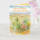 Custom happy first Easter greetings for a grandchild or other special child decorated with a cottontail in the desert on a warm spring day sitting among the sagebrush with yellow wildflowers in bloom hand drawn with ink and watercolor. On the inside is another little cottontail rabbit, a shade of bright yellow, and text you can edit to fit your needs.