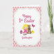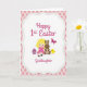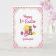 The front design shows a young blonde girl in a magenta dress sitting with a gentle smile, her posture turned slightly towards a friendly long-eared brown bunny 🐰 and a tiny yellow bird as if they’re sharing a quiet moment together. A striped oval egg in magenta and teal rests beside her, adding a festive touch to the scene. Above them, a small red-winged insect hovers, bringing a bit of motion to the soft palette. The illustration sits inside a wide area of creamy white space, framed by a scalloped edge with tiny dotted details. Outside the frame, the background is filled with soft pink and beige diamonds arranged like a light plaid fabric. At the top, a seasonal greeting appears in looping magenta lettering, while a shorter dedication line in matching magenta sits along the bottom margin beneath the picture 🌷. The border is scalloped in pale tones with evenly spaced dots tracing the curves.