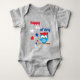 This Happy Fourth of July Patriotic Owl is ushering in the celebration of Independence day. Featuring a grey baby's bodysuit, this item has "Happy 4th of July" written in red, white, and blue fun font. Underneath is a blue owl with red hair sitting on a branch. The branch has stars bursting from it. Colourful and creative purchase your baby clothing today!
