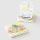 The coasters are gorgeous, a quality feel and heavy weight. They look like a precious archeological find. A rustic stone juxtaposed with a modern floral black and white print. I like the way the print goes slightly imperfect on the cut stone edges giving them a kind-of natural beauty.