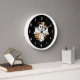A clock with an illustration of a smiling ghost. Decorated with flowers, rainbows and bats.
