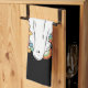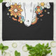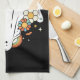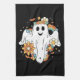 Kitchen towel with an illustration of a smiling ghost. Decorated with flowers, rainbows and bats.