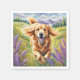Airbrush painting of a golden retriever running in a field of lavender flowers with a purple mountain background.