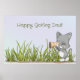 An adorable kitten sporting a spyglass spots Dad's golf ball in the weeds.