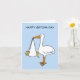 A simple illustration of a cat being held in a white sheet which is hanging from the beak of a giant stork. The image is set against a pale blue colored background and accompanie by the words 'Happy Gotcha Day'.