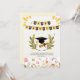 This is a vertical greeting card design with a clean, white background. At the top, there are decorative elements resembling hanging paper flags or banners. The upper banner reads "HAPPY" on black flags with beige letters, and the lower banner reads "GRADUATION" on beige flags with black letters. There are also yellow, abstract shapes in the upper corners that look like confetti or sun rays. The central part of the card features a detailed illustration of a black graduation cap with a golden tassel, centred between two olive or laurel branches. Below this main illustration, there's a simple, elegant quote in a serif font that says, ""A new chapter, a great start. The world is impatiently waiting to see how you will change it for the better."" The bottom of the card is decorated with a border of delicate, watercolor-style flowers and leaves in shades of pink, orange, and green. The overall design is celebratory, sophisticated, and conveys a sense of hope and achievement.