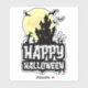 Happy Halloween text design illustration with haunted house, cemetery and bats decoration at full moon on white background