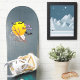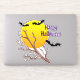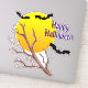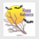 A fun Halloween sticker features a bright yellow full moon on an orange background, with a tree branch and three bats in the foreground. The "Happy Halloween" text can be customised.