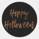 Happy Halloween Black and Orange Halloween Sticker. The Happy Halloween sticker uses the popular gold foil typography. This sticker is used to seal Happy Halloween Black and Orange Halloween Invitations.