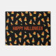 Trick or treat! Festive door mat features an allover candy corn print in swirly watercolors, on a spooky black background with "Happy Halloween" in festive orange text. Coordinating items available in our shop!