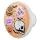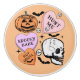 Colourful Halloween illustration with skulls, bats, stars, pumpkin and candy hearts decoration with "Spooky babe", "Hunt me" and "Hot Ghoul" text designs