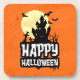 Happy Halloween text design illustration with haunted house, cemetery and bats decoration at full moon on grunge orange background