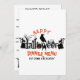 Cool spooky halloween concept design where letters are made with images of halloween symbols. Scary halloween trees, bats, pumpkins, black crow and flying bats. Customisable text for halloween dinner menu. Eat drink and be scary.