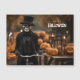 A skeleton with a bicycle among cute Halloween pumpkins and lanterns. Happy Halloween Magnetic Card