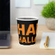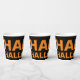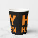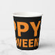 For those who don't like a lot fuss or frills this paper cup features a simple design with type. This Halloween theme cup features a basic black background. In orange, the words "HAPPY HALLOWEEN" wrap around the mug. There is an image of a pumpkin in place of the "o", in the word "HALLOWEEN".
