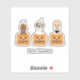 Illustration of three dogs in pumpkins dressed in Halloween attire.