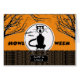 Happy Howloween for an Aunt and Uncle, Scaredy Cat paper greeting card. Features a vintage illustration of a cat on a fence howling at the full moon and bats behind it. Halloween greeting card with dead trees, moon, cat, bats and fence. Art, image, and verse copyright © Shoaff Ballanger Studios.