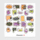 Fun, whimsical, spooky Halloween stickers featuring a witch, black cat, spider, spider web, bat, pumpkin and skull and cross bones.