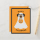 Illustration of a dog dressed as a ghost trick or treating for Halloween.