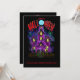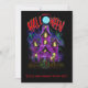 Glowing haunted house with ghosts, monsters and zombies in a full moon Halloween night scene. Full colour illustrated design features tones of fluorescent purples, blues and greens. Text at top of design reads: "Happy Halloween" in bright red with big 'O' as the moon!