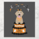Illustration of a Golden Retriever popping out of a cake and wearing a "boo" head band. With a Halloween theme and colours.