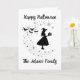 A graceful witch silhouette in a flowing dress holds a smiling jack-o’-lantern while a swirl of twinkling stars curves in a crescent around her and a small flock of bats drifts above. Minimal black-on-white artwork for an elegant, witchy vibe—perfect for Halloween greetings, October birthdays, or party invites. Personalise the front and inside with your message, names, and date.